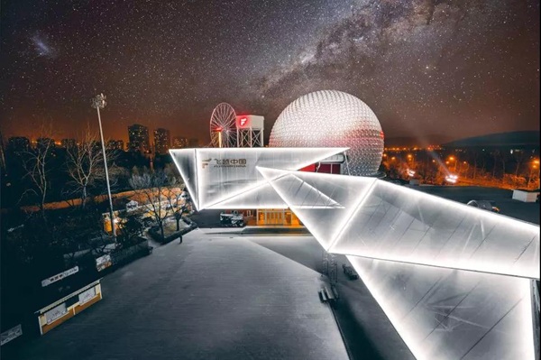 影院高32.8米,總占地總面積3600平方米。外觀的球形頂,代表著神秘浩瀚的宇宙和閃爍星空,神秘又等待著探索。外圍建筑狀似飛翼,采用的是鋼絲膜強(qiáng)化來建筑造型,展現(xiàn)建筑“飛躍”之勢,正與“飛越中國”這一主題相契合!