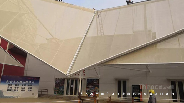隨著球幕外立面光色切換,“我愛你中國”、“飛覽天下飛越中國”等主題字幕滾動播出。為實現(xiàn)預(yù)期的設(shè)計效果,信達(dá)團(tuán)隊多次夜間試燈。
